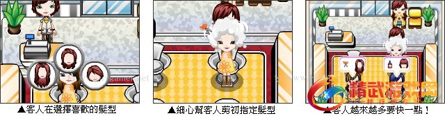 这间好莱坞髮型中心提供了各式各样的顶级服务,帮你的头髮作出最美的造型,游戏一开始客人会先坐在门口旁边的沙发等候座位,接着用滑鼠人拖曳到位子上,他们会开始指定要剪的髮型或是想要染的颜色,客人多到要排队所以速度要快一点喔,如果弄错髮型的话客人就不会付钱啰!