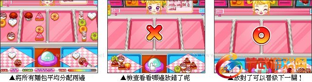 阿 sue 再镇上新开了一间麵包店,里面有各式各样的麵包,看了真是让人想要每种口味都来一个,游戏画面盘子上会摆上各种麵包,你要平均将所有麵包分在两个包装纸上,两边的数量都是要一样的,再按下中间的ok键就可以了,时间会越来越快喔!快加快速度。