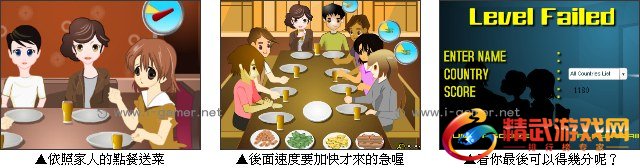 家庭宴会开始了,现在由你来扮演主角并且来服务大家,餐桌上摆着各式各样的料理,有的要喝汤有的要吃三明治,三明治要先把吐司放在中间的盘子再开始料理才可以端出去给家人,速度会一直加快,人数也会一直增加,小心别送错啰!