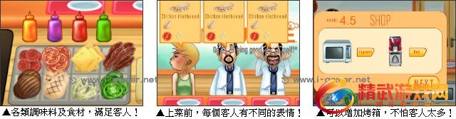 游戏操作:使用滑鼠操作先将捲饼拖曳到中间调理台接着点选所需配料再拖曳至微波炉,最后再将成品拖曳到客人的盘子里。