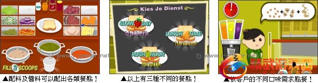 在速食店打工是什么样的情况呢?这个游戏可以让你体会到啰,客人点的菜有好多种,注意不要弄错,依照客人的点餐点选中间的图示,例如,客人点汤,就先点选中间的汤碗,接着会跳出汤的口味,在点出正确的口味,游戏有时间限制,客人的旁边也有情绪指数,别让可人等太久,否则就赚不到钱了。