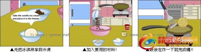油炸冰淇淋的游戏可不如你想像中的简单喔,在油炸之前可是有很多步骤的喔!首先要把冰淇淋放进冰箱冷冻,接着在等待冷冻的时间要把配料都先准备好,先打入鸡蛋接着加入一些饼乾搅拌,冰淇淋差不多久可以拿出来裹上一层刚刚做好的配料,接着再裹上一层麵包粉,在放到冰箱中冷冻一下会更美味,拿出来后就可以放到油锅炸了。把麵包放入油锅中,大约一分钟就可以炸到金黄色的,就可以起锅啦,是不是很快就完成了一道美味的点心呢?快来动手试试看吧!