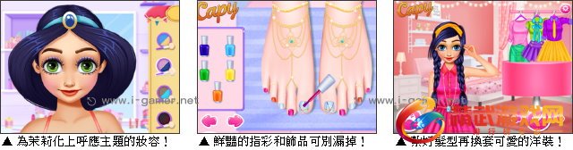 游戏操作:以滑鼠操作进行游戏,点击化妆品、服装、指甲油装扮茉莉。