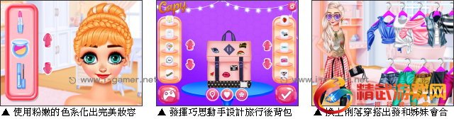而在那之前,还是得先找出一个适用的包包,装上表演要使用的服装和各种行李喽。另外,为了搭乘飞机,穿着当然尽可能以俐落舒适为重点,但要注意的是,时尚可是艾莎绝不能抛弃的重点,在帮忙造型时可要多费心啦! 游戏操作:以滑鼠操作进行游戏,点击化妆品、服装、配件装扮艾莎和安娜。