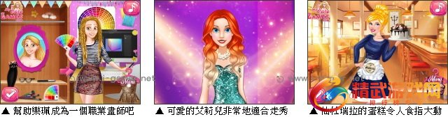迪士尼的公主们除了当公主以外,都有着各种不同的人生规划。可爱的乐珮想当个职业画师、美丽的仙杜瑞拉想当个派对主厨,而最热情可人的艾莉儿则想当个模特儿!不论她们会是什么职业,都需要好好打扮一番!身上的穿着以外,该职业的相关配件也都要一应具全!玩家们快来帮忙她们吧!