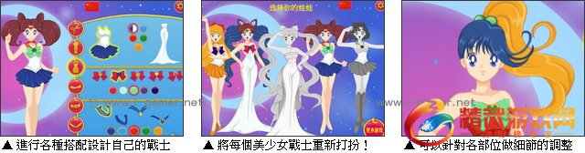 还记得月光仙子那华丽的变身以及装扮吗?现在带你回味童年,让你来设计属于自己的美少女战士!游戏中,玩家可以对五个美少女战士进行装扮的调整,不论是前发、后发以及发色,抑或是身上的穿着与装扮,都可以进行大幅度的调正唷!热爱美少女战士的你快来尝试看看吧!