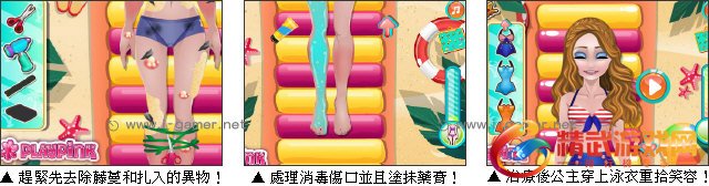 游戏操作:以滑鼠操作进行游戏,点击道具给公主治疗伤口,然后为她选套泳装重现迷人风采。