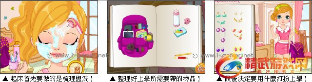 游戏操作:以滑鼠点击物品等为女孩洗漱、整理书包并为她打扮。