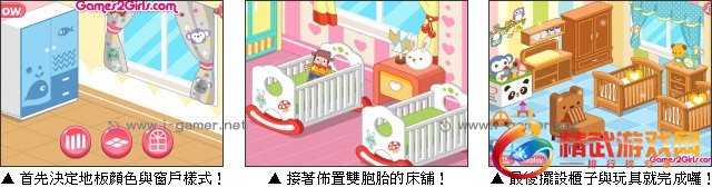 游戏操作:以滑鼠点击物品,布置双胞胎宝贝房间。