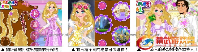 长发公主马上就要嫁给自己心爱的王子了,为了打造一场梦幻婚礼,她找出许多光彩缤纷的服装、首饰搭配,玩家要帮她从头到脚仔细的精心打扮一番,无论是发型、婚纱礼服,都有各式各样不同风格,可以让你任意搭配,也能选择自己喜爱的捧花喔,赶紧帮公主好好装扮,让她能顺利当个漂亮新娘吧!