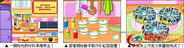 游戏操作:以滑鼠操作进行游戏,根据提示点击 / 拖动食材制作甜甜圈。
