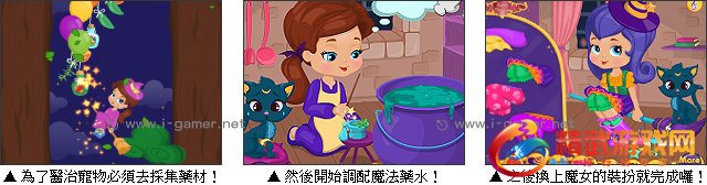 小魔女的宠物不小心受伤了,为了要治疗自己的小猫,小魔女必须骑着她的魔法扫把,去森林里採集药材来制作魔法药水来帮牠医治,让牠能恢复健康。这是一款装扮游戏,玩家在过程中要帮小魔女收集足够的药材,才能进行调配魔法药水帮小猫治疗,最后帮小魔女搭配出各种不同的饰品,换上魔法服装就大功告城啰!