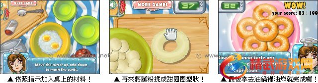 游戏操作:以滑鼠操作进行游戏,根据提示点击 / 拖动道具制作甜甜圈。