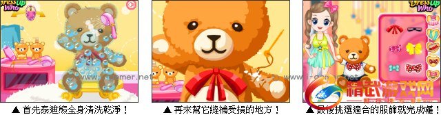 游戏操作:以滑鼠操作进行游戏,点击道具清洗泰迪熊给人物换装打扮。
