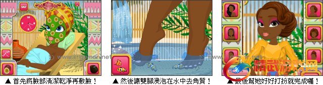 这是一间很有特色的美容店,在这里所有的 SPA 疗程都与其他家的方式不一样,可以让人在这里得到放鬆,消除疲劳,更还能让使肌肤越变越美丽,赶紧来体验看看,成为人见人爱的美女吧。游戏中先按照步骤来清洁脸部,敷上面膜,再把双脚浸泡在温水中,依照指示进行去角质,最后帮人物打扮的漂漂亮亮,就大功告成啰!