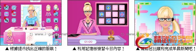 芭比凭藉着自身才能、美貌拥有着一份新闻主播的职业,今天她突然接到通知说要在早间新闻做一个特别报导,现在时间快来不及了,快来帮助芭比为她晨间新闻做准备吧。玩家必须在时间之内根据提示将芭比打扮妥当,并利用记忆板复习新闻内容,最后在播报时将摄影机对好焦就可以顺利完成晨间新闻了喔!