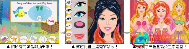 芭比很喜欢看浪漫的童话书,常幻想能成为书中的公主,今天她将要进入童话故事的世界里。游戏中有长发公主、美人鱼公主及阿拉丁里的茉莉公主,你要将芭比分别打造成三种不同的造型,每位公主都有不一样的服饰及配件可以选择搭配。快来帮芭比打扮成梦幻的童话人物,完成她的梦想。