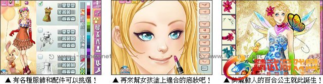 游戏操作:以滑鼠操作进行游戏,点击饰品给百合公主化妆,服饰给百合公主换装打扮。
